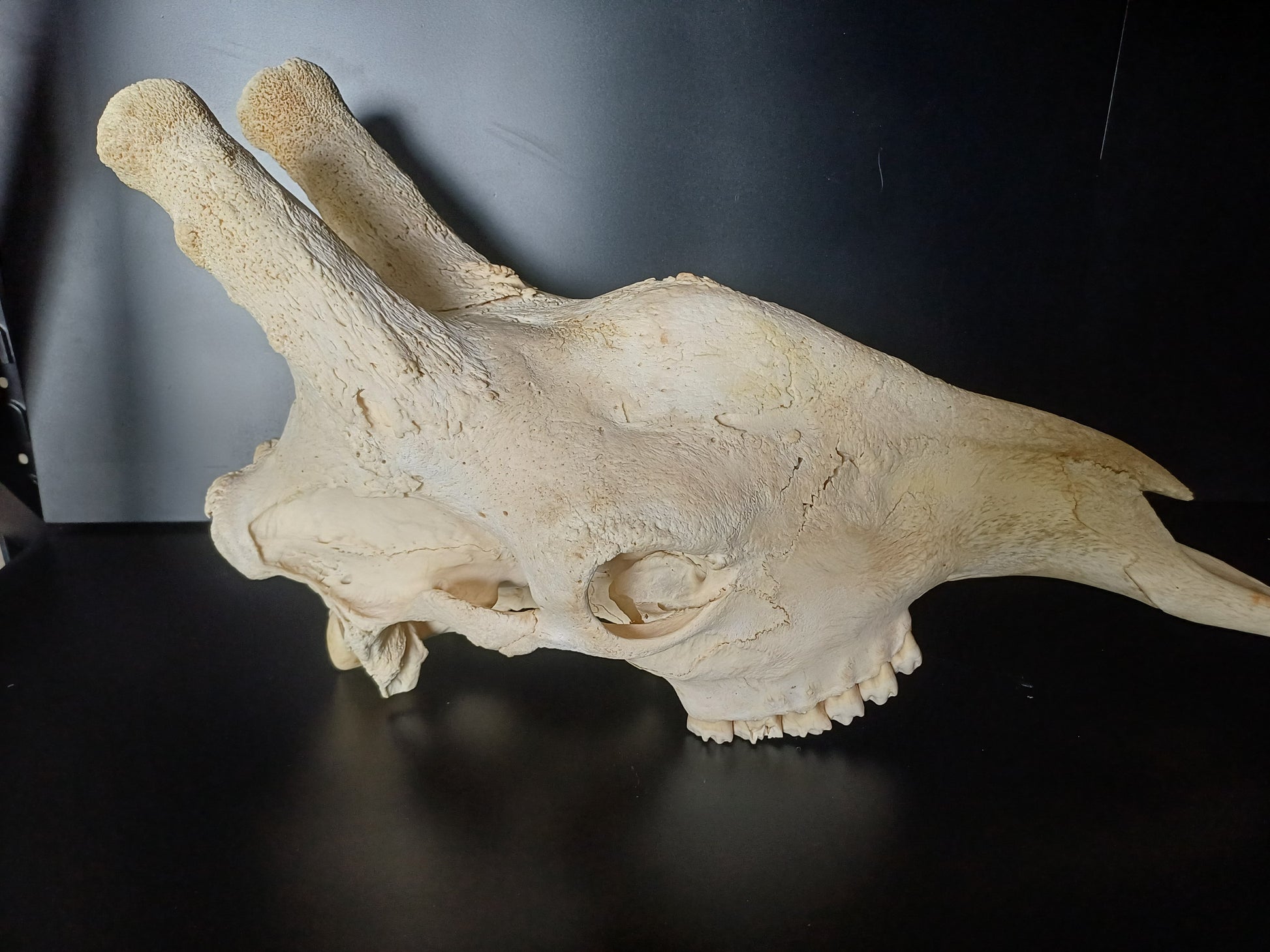 Large male giraffe skull top, no lower mandible.